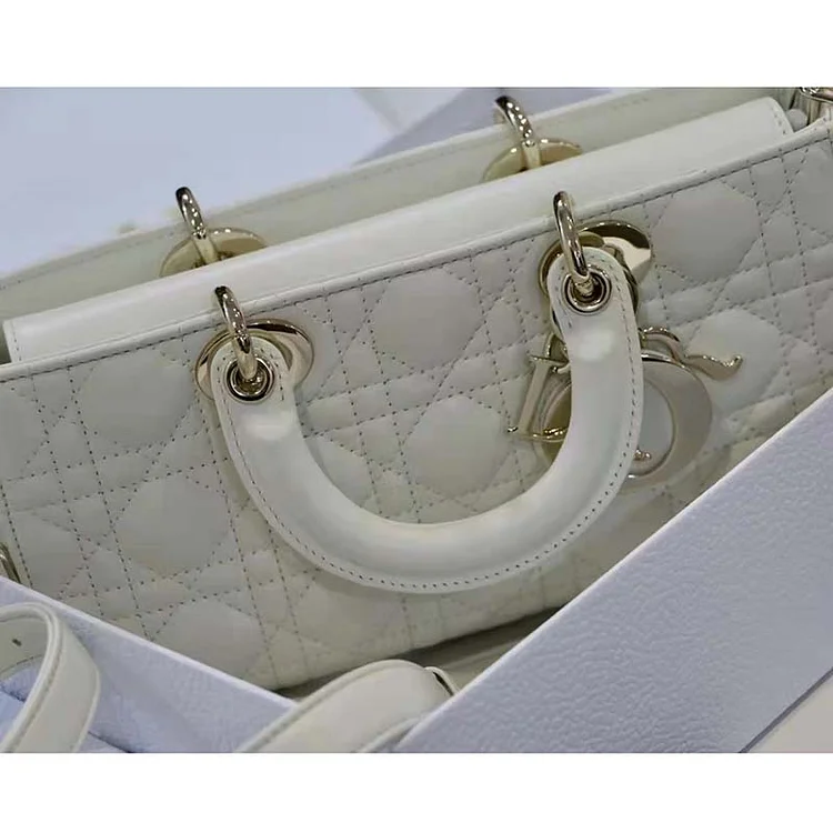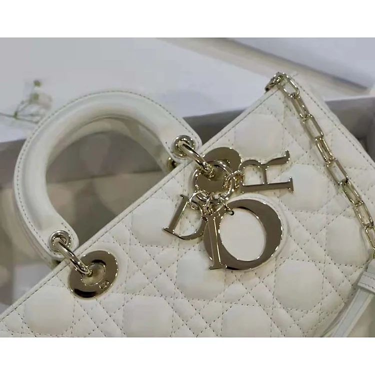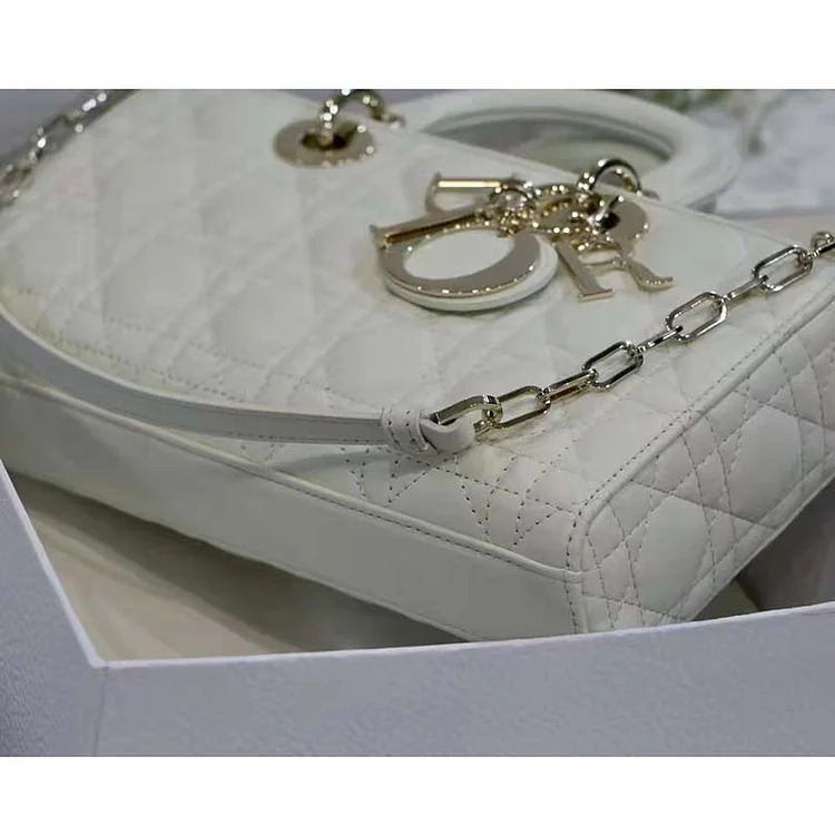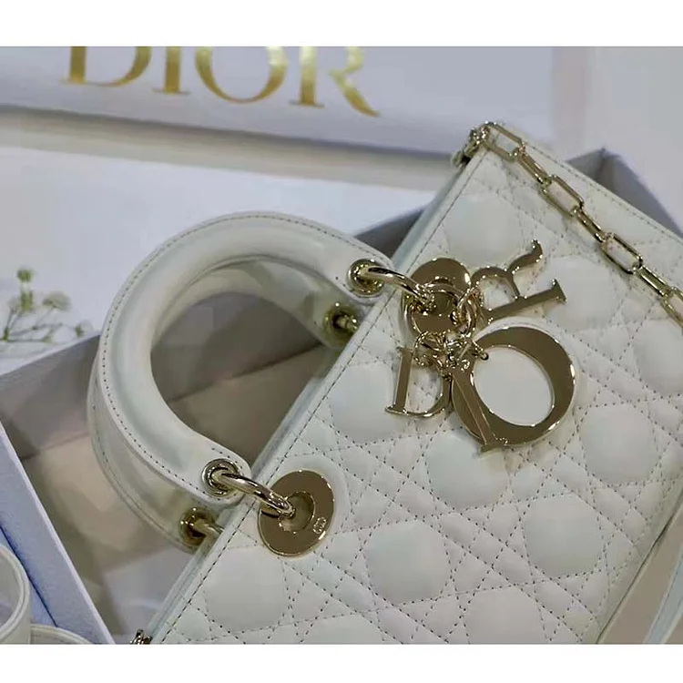 Crafted in latte lambskin with Cannage stitching. the refined and timeless style is enhanced by pale gold-finish metal ‘D.I.O.R.’ charms elegantly embellishing its silhouette.