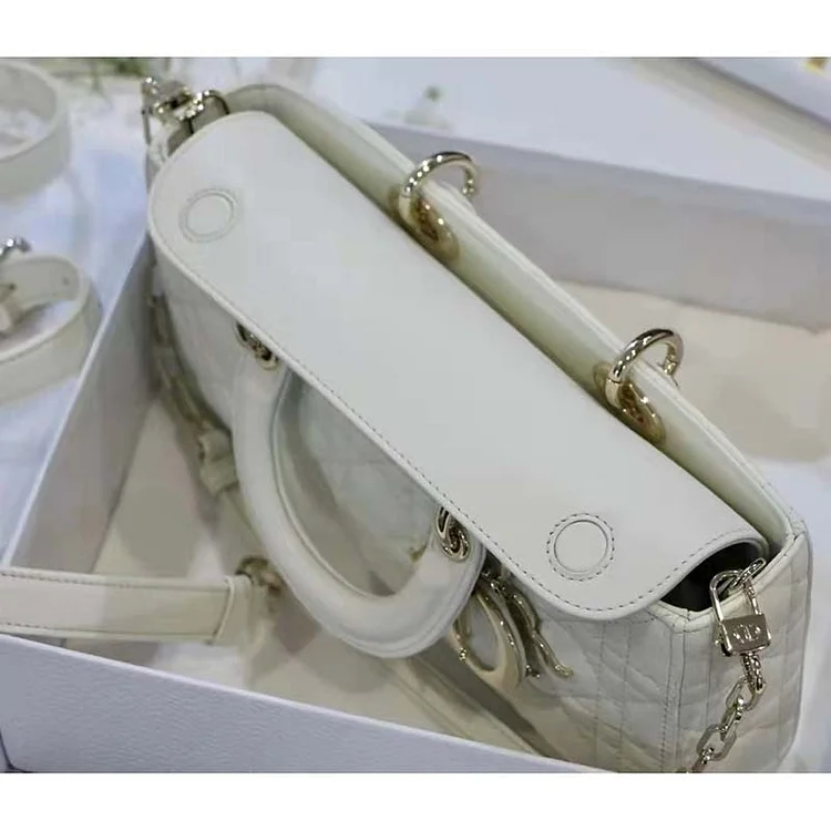 Featuring one removable chain shoulder strap and another adjustable and removable leather shoulder strap. the Lady D-Joy bag can be carried by hand. worn over the shoulder or crossbody as a daily companion.
