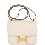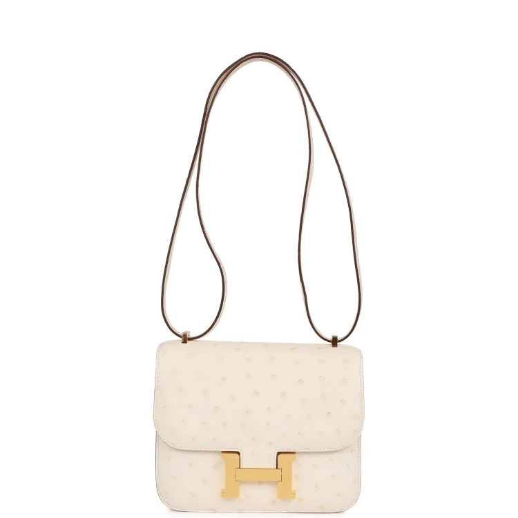 This Constance is ofNata ostrich withgold hardware and featurestonal stitching. a ‘H’ snap lock closure. and an adjustable shoulder strap.