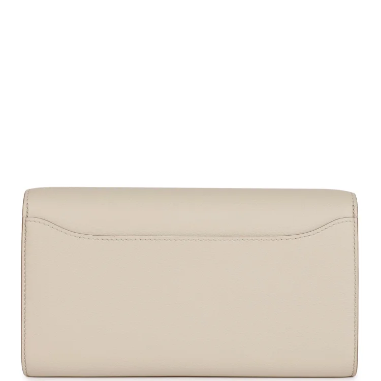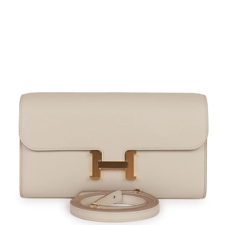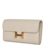 This Constance Wallet To Go is in Beton evercolor leather withgold hardware and hastonal stitching. metal ‘H’ snap lock closure. open front compartment and removable crossbody strap.