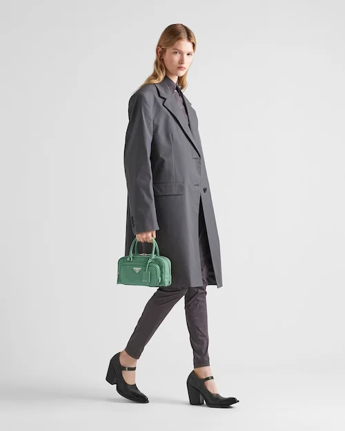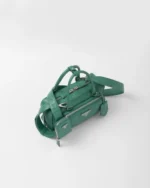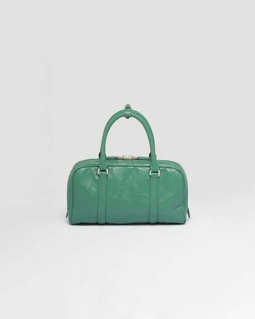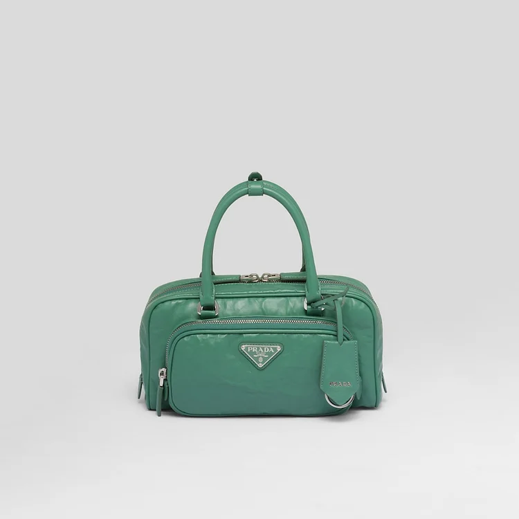 This bag with casual. classic allure is made of glossy nappa leather with a natural finish. A handmade wrinkled effect contrasts with the constructed and rigid concept. reinterpreting an everyday object to be worn without constraints. Presented in the Spring Summer 2023 collection. the style that is a re-edition of an accessory presented in 2001 is enhanced by the enameled metal triangle logo.
