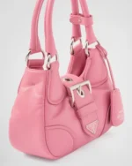 Reimagining the iconic lines of a model from the PP archives from the 2000s. this nappa leather bag combines traditional elements reinterpreting them in a new way. with an innovative soft design. Softness and simplicity of the silhouette define this hobo bag. embellished by the ton-sur-ton triangle logo that frames the lettering logo. creating a three-dimensional and material game and enriching the design of the accessory.