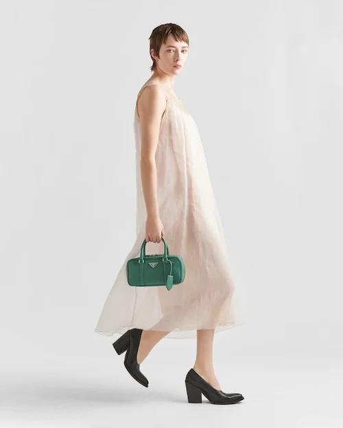This bag with casual. classic allure is made of glossy nappa leather with a natural finish. The handmade wrinkled effect contrasts with the concept of a rigid construction. reinterpreting an everyday object that can be worn without constraints. Presented for the Spring Summer 2023 collection. the accessory that is a re-edition of a bag presented in 2001 is decorated with the enameled metal triangle logo.